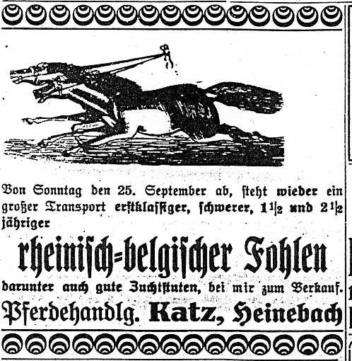 1921 - wieder einmal ist eine neue Lieferung guter Pferde bei Pferdehändler Katz eingetroffen. Er informiert seine Kunden durch die Presse.